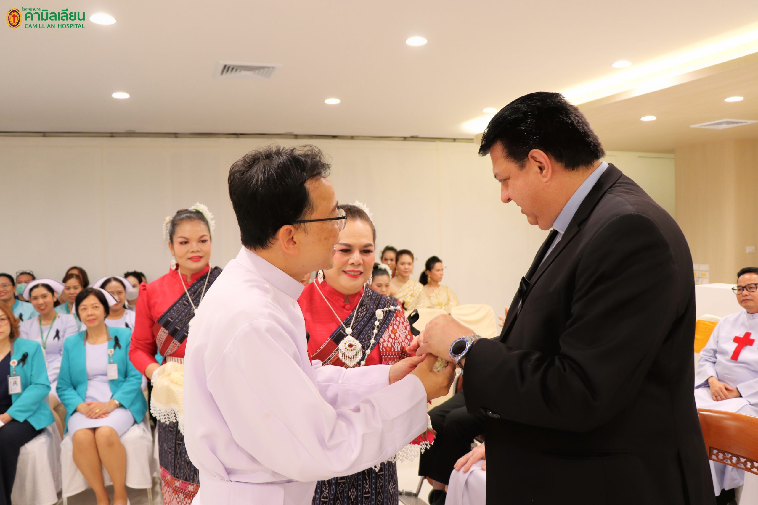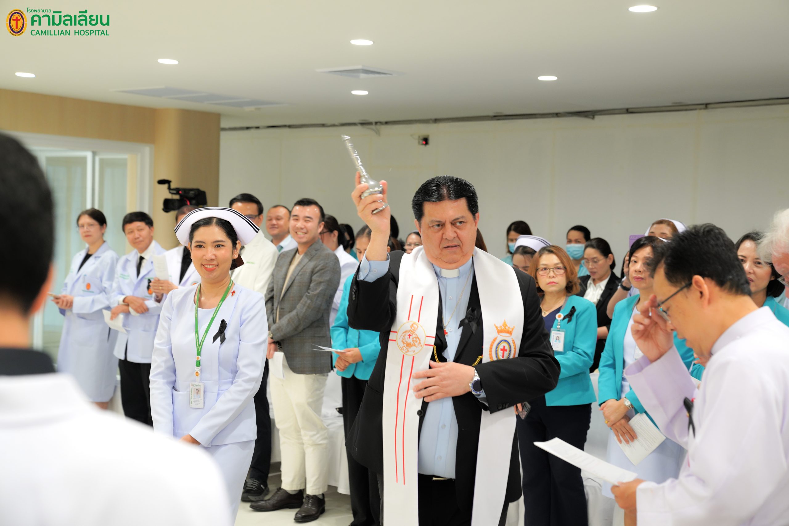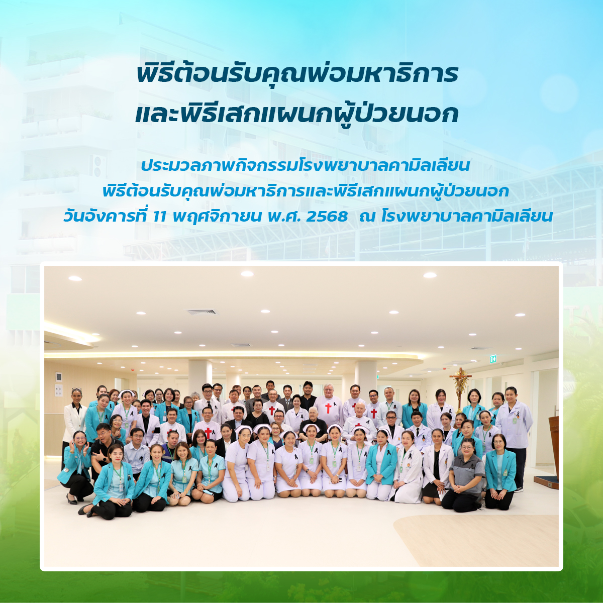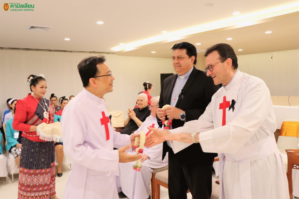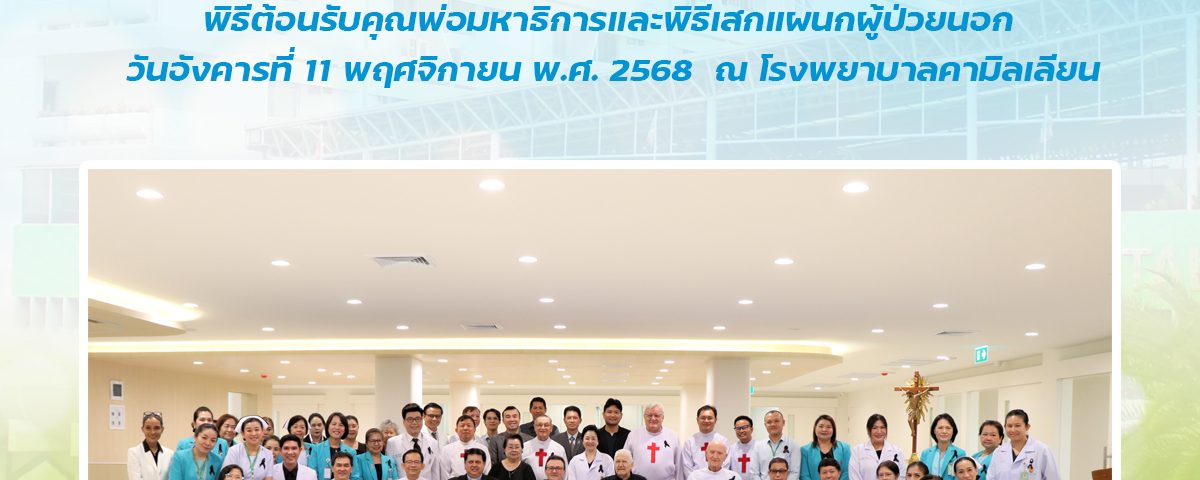 พิธีต้อนรับคุณพ่อมหาธิการ และพิธีเสกแผนกผู้ป่วยนอก วันอังคารที่ 11 พฤศจิกายน พ.ศ. 2568 เวลา 09.00 น. โรงพยาบาลคามิลเลียน โดย คุณพ่อ ภควี เส็งเจริญ ผู้อำนวยการโรงพยาบาลฯ คณะนักบวช แพทย์ และบุคลากรของโรงพยาบาลคามิลเลียน ตลอดจน ผู้สนับสนุนและผู้มีเกียรติทุกท่าน มีความยินดีในการจัดการต้อนรับ คุณพ่อ เปโดร ตรามอนติน (คุณพ่อมหาธิการคณะนักบวชคามิลเลียน) และคุณพ่อ จิอันฟรานโก ลูนาร์ดอน (คุณพ่อรองมหาธิการคณะนักบวชคามิลเลียน) ในโอกาสเยี่ยมสมาชิกนักบวชคามิลเลียนแขวงประเทศไทย และในโอกาสนี้ ทางโรงพยาบาล คามิลเลียน ยังได้รับเกียรติจากคุณพ่อ เปโดร ตรามอนติน เป็นประธานในพิธีเสกแผนกผู้ป่วยนอก ของโรงพยาบาลฯ ที่ได้ปรับปรุงใหม่ด้วย และนอกจากนั้น คุณพ่อมหาธิการฯ และรองมหาธิการฯ ยังได้ให้เกียรติทานอาหารร่วมกันด้วยบรรยากาศอบอุ่นแบบครอบครัว พร้อมทั้ง ได้รับชมวัฒนธรรมไทยผ่านทางการแสดงต่างๆ ทั้งการรำ การเต้น และการแสดงขิม จากบุคลากรของโรงพยาบาลฯ ด้วย