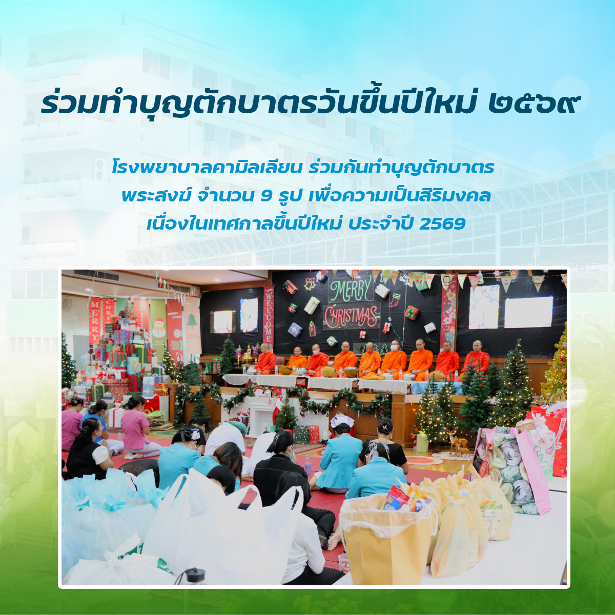 วันศุกร์ที่ 9 มกราคม 2569 คณะผู้บริหารโรงพยาบาลและบุคลากรโรงพยาบาลคามิลเลียน ร่วมกันทำบุญตักบาตร พระสงฆ์ จำนวน 9 รูป เพื่อความเป็นสิริมงคลเนื่องในเทศกาลขึ้นปีใหม่ ประจำปี 2569