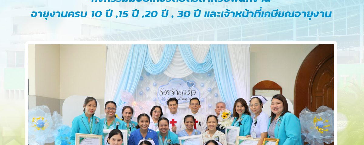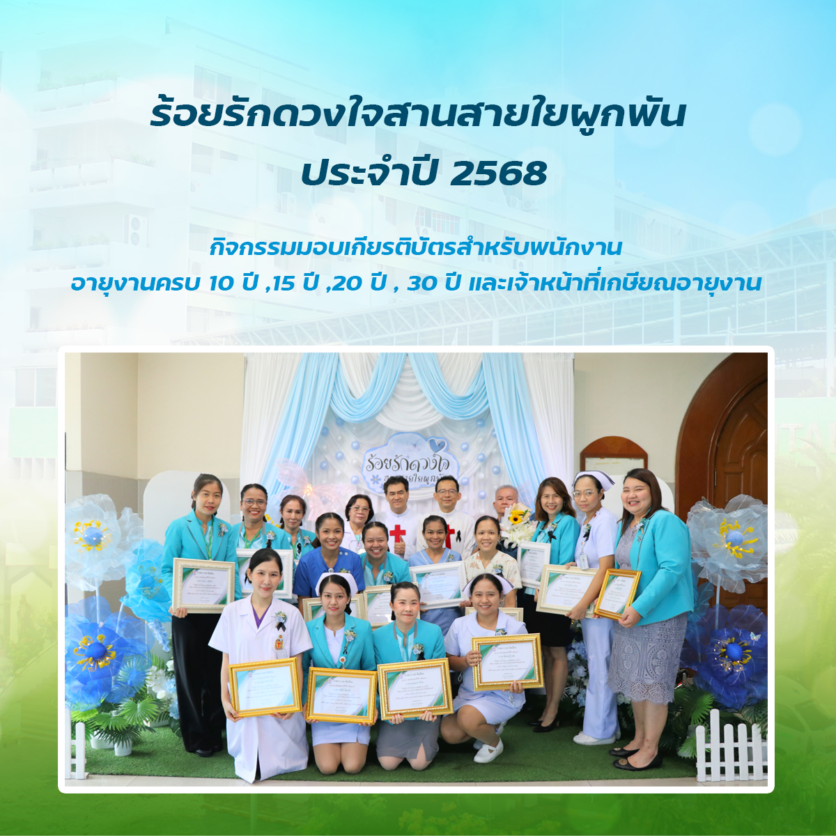 วันอังคารที่ 9 ธันวาคม 2568 โรงพยาบาลคามิลเลียนจัดกิจกรรม “ร้อยรักดวงใจ สานสายใยผูกพัน” โดยภายในงานได้รับเกียรติจากบาทหลวงภควี เส็งเจริญ ผู้อำนวยการโรงพยาบาล และบาทหลวงปรีดา เวียงชัย รองผู้อำนวยการฝ่ายบัญชีและการเงิน ร่วมกิจกรรมมอบเกียรติบัตรสำหรับพนักงานอายุงานครบ 10 ปี ,15 ปี ,20 ปี , 30 ปี และเจ้าหน้าที่เกษียณอายุงาน กิจกรรมดังกล่าวจัดขึ้นเพื่อเป็นกำลังใจให้แก่เจ้าหน้าที่ ที่ได้ทุ่มเททั้งกายและใจเพื่อการทำงาน